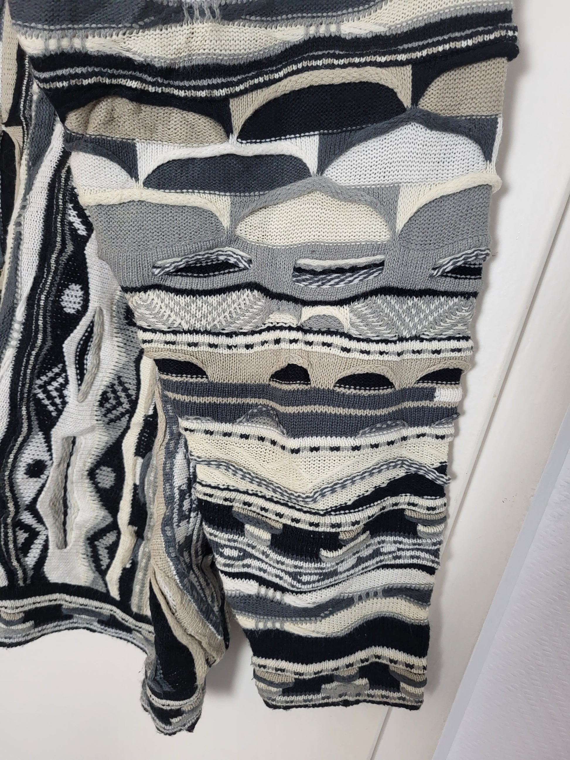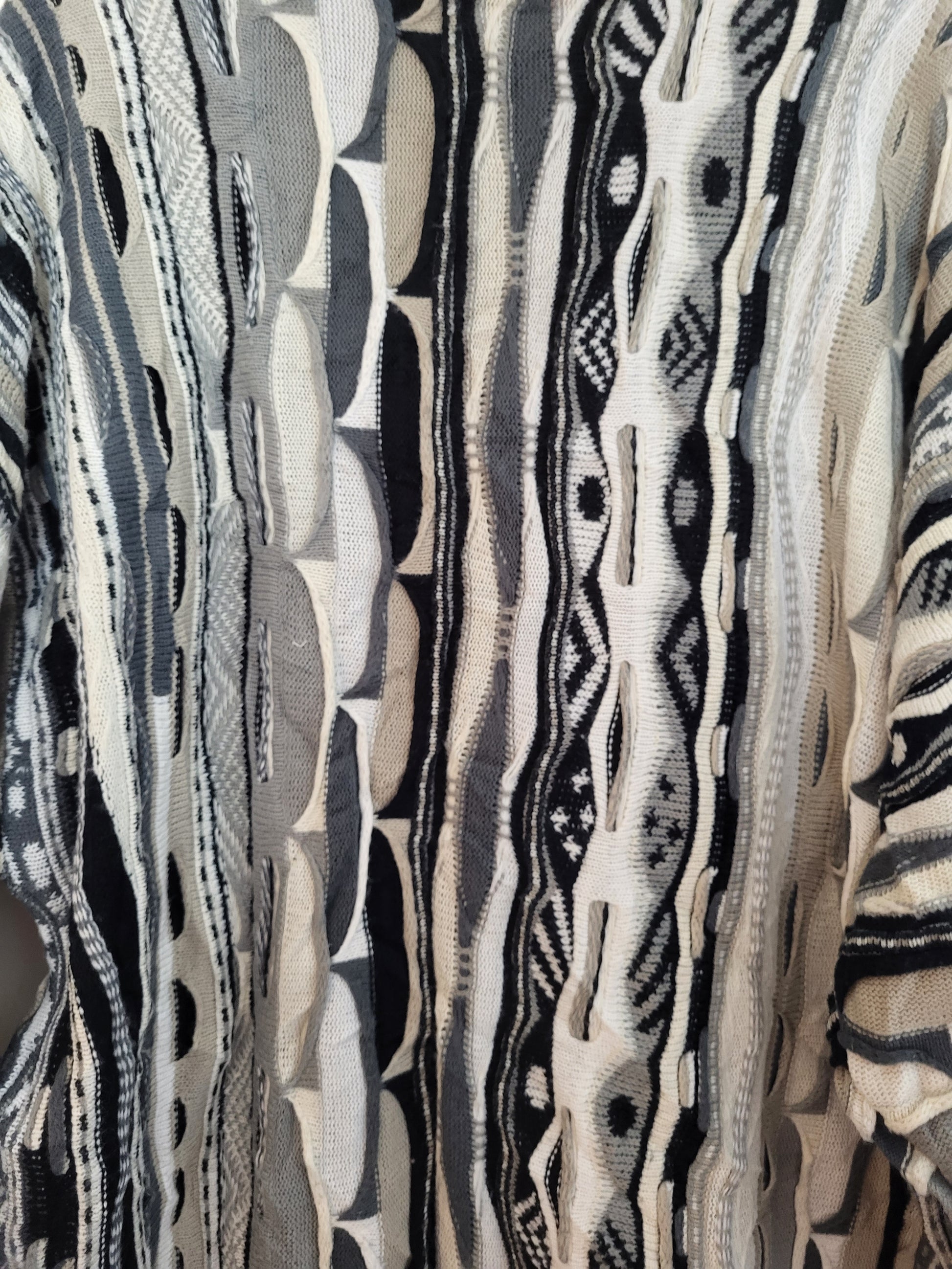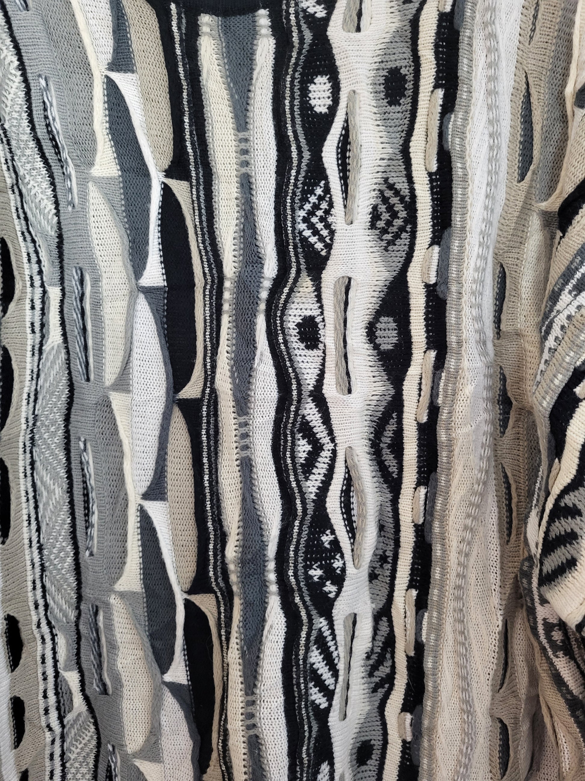 Sehr wertiger Stoff, fühlt sich wunderbar an. Typisches COOGI 3D-Muster der 90er Jahre. Schwere Verarbeitungsqualität und einzigartiges Muster.