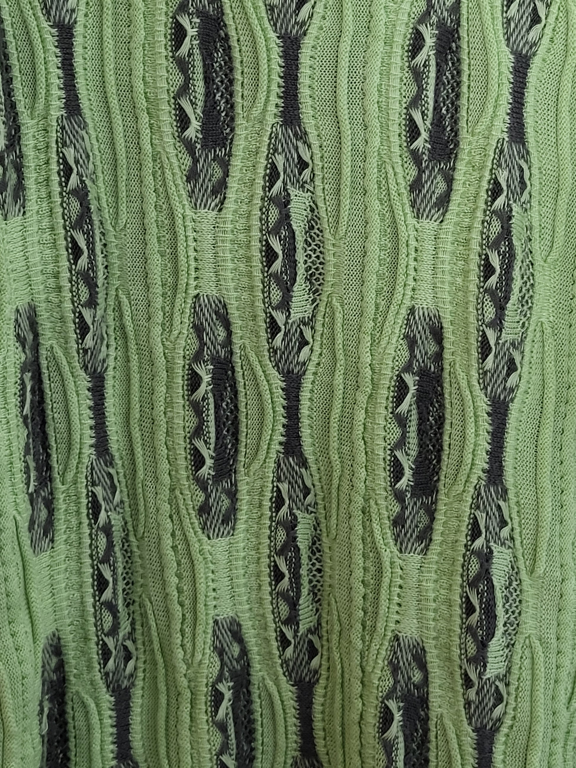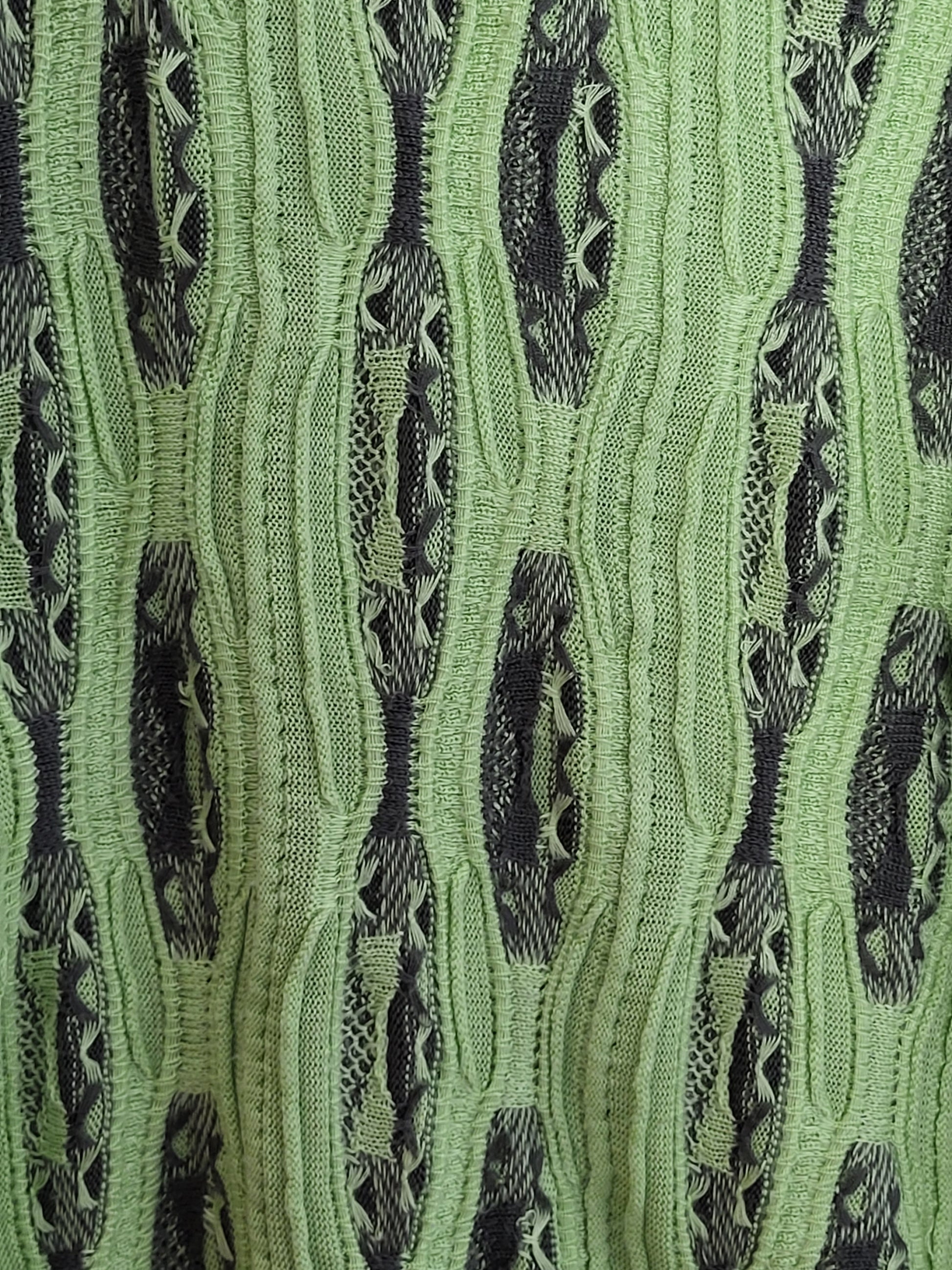 Sehr wertiger Stoff, fühlt sich wunderbar an. Typisches COOGI 3D-Muster der 90er Jahre. Schwere Verarbeitungsqualität und einzigartiges Muster. Saftige Farben und ein abwechslungsreiches Muster