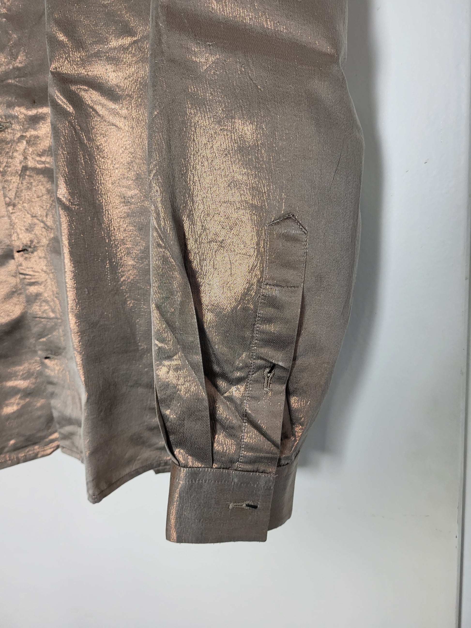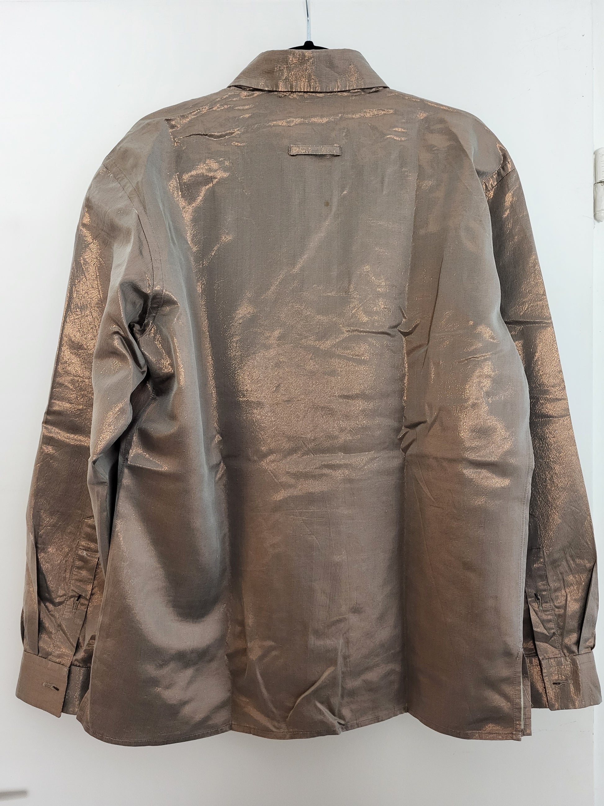 Sehr wertiger Stoff, fühlt sich wunderbar an. Das Hemd verfügt über Haken und keine Knöpfe. Bronzefarbener Seidenstoff, welcher in der Sonne am besten zur Geltung kommt.