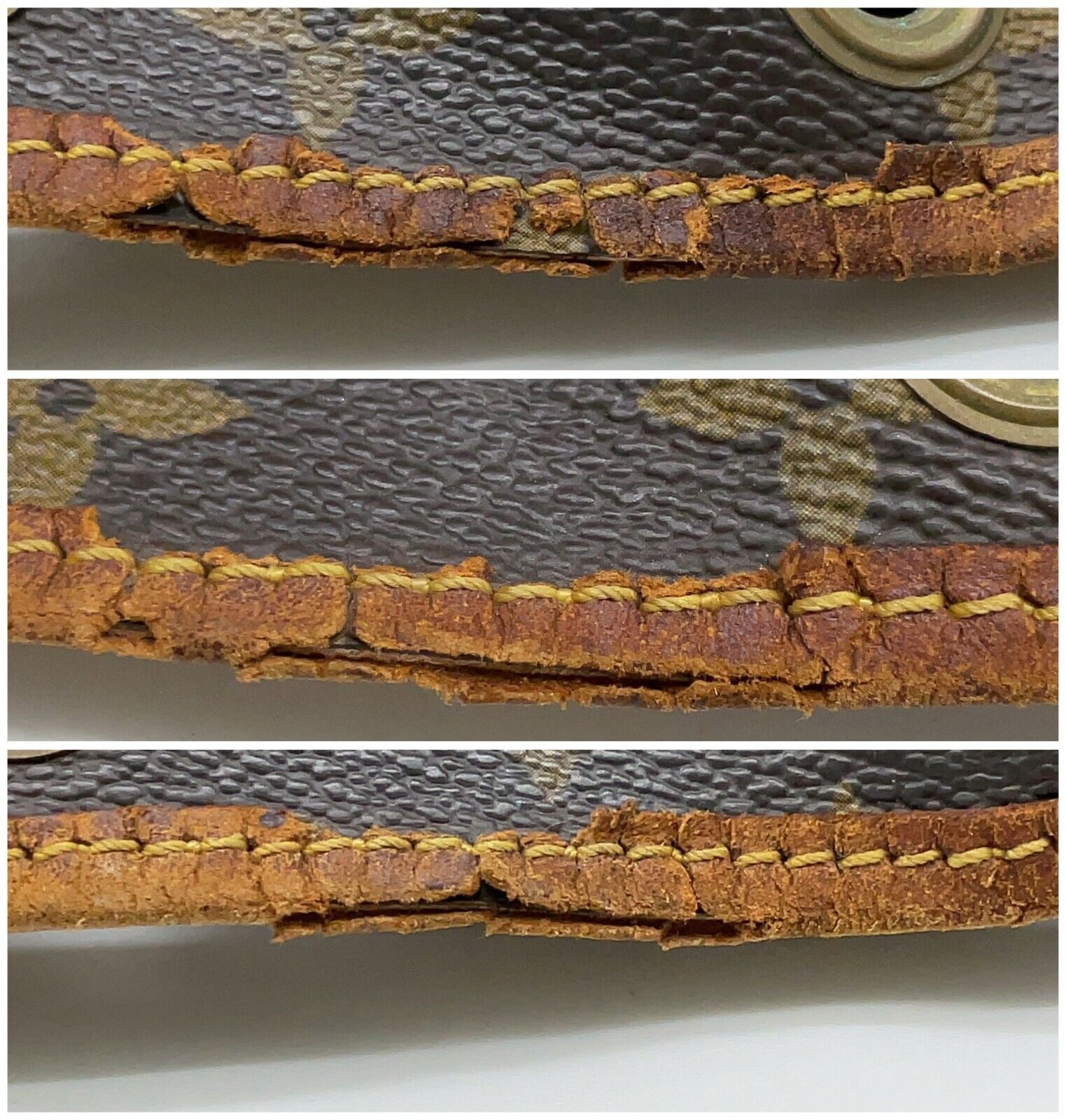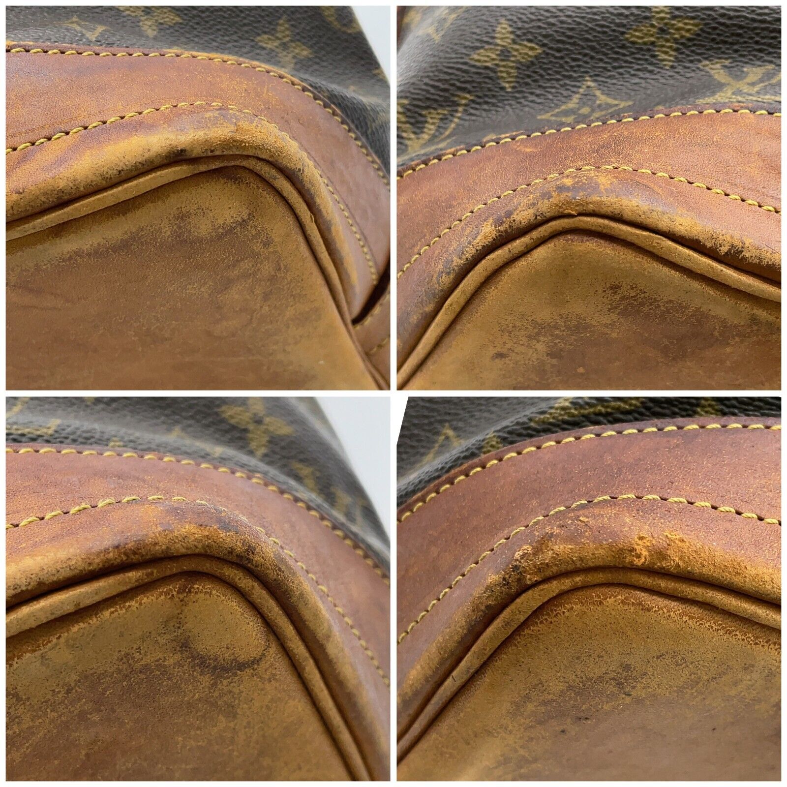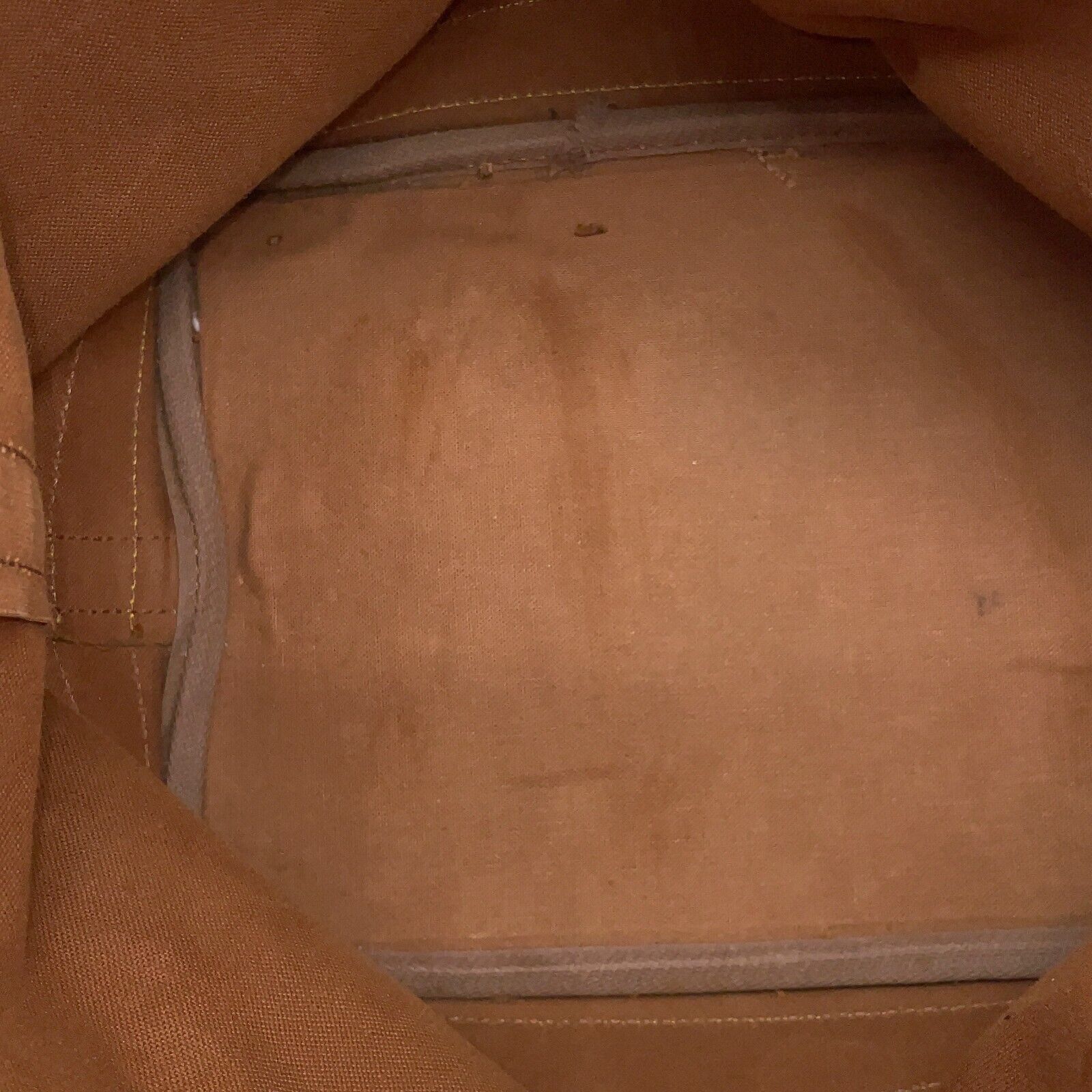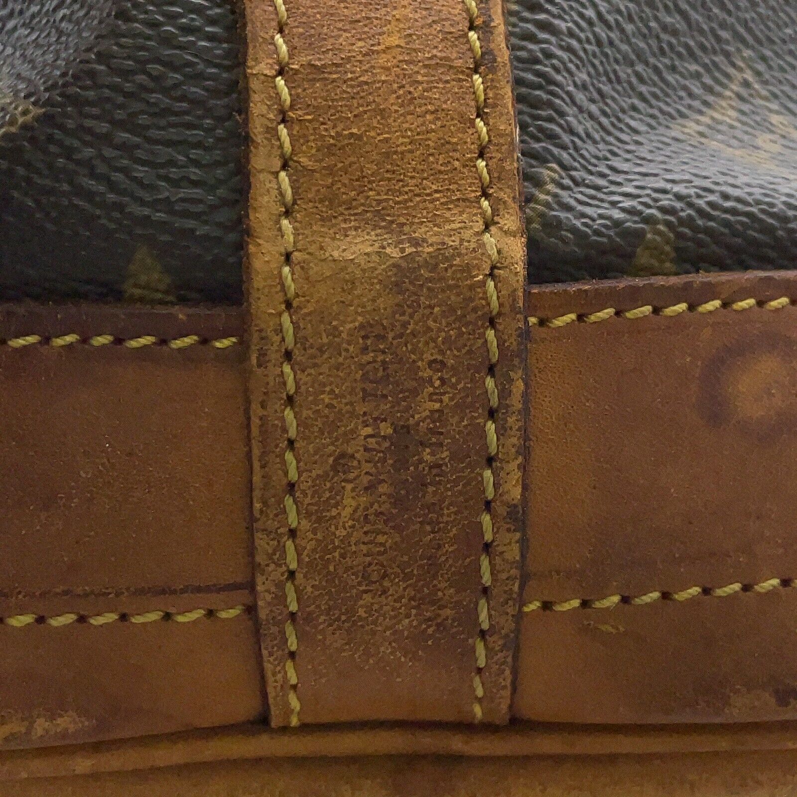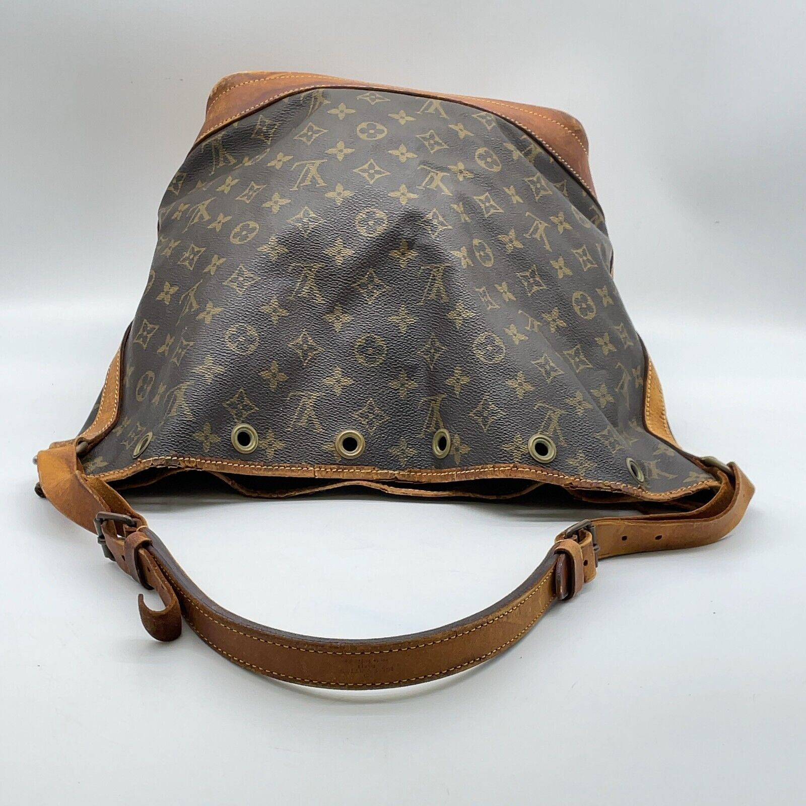Monogramm-Canvas in einem sehr guten Zustand, Leder in einem guten Vintage-Zustand (leichte Wasserflecken, oberer Lederrand etwas beschädigt) und hervorragende Verarbeitung. Schulterriemen in einem guten Zustand. Zugband fehlt und müsste ersetzt werden.